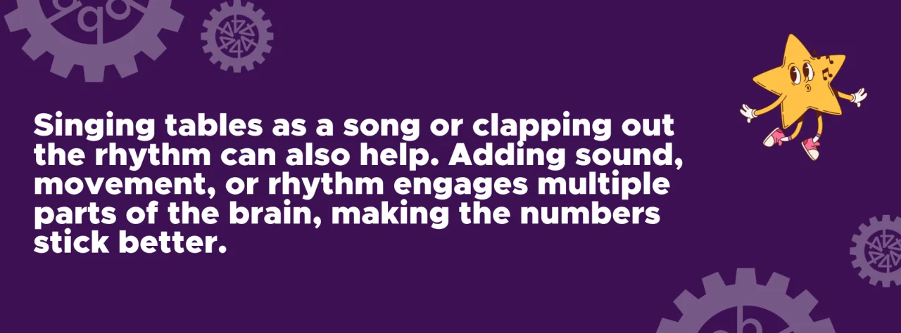 Times tables often have patterns that can make them easier to learn. For example, the 9 times table has a neat pattern where the digits in the answer always add up to nine. Singing tables as a song or clapping out the rhythm can also help. Adding sound, movement, or rhythm engages multiple parts of the brain, making the numbers stick better.