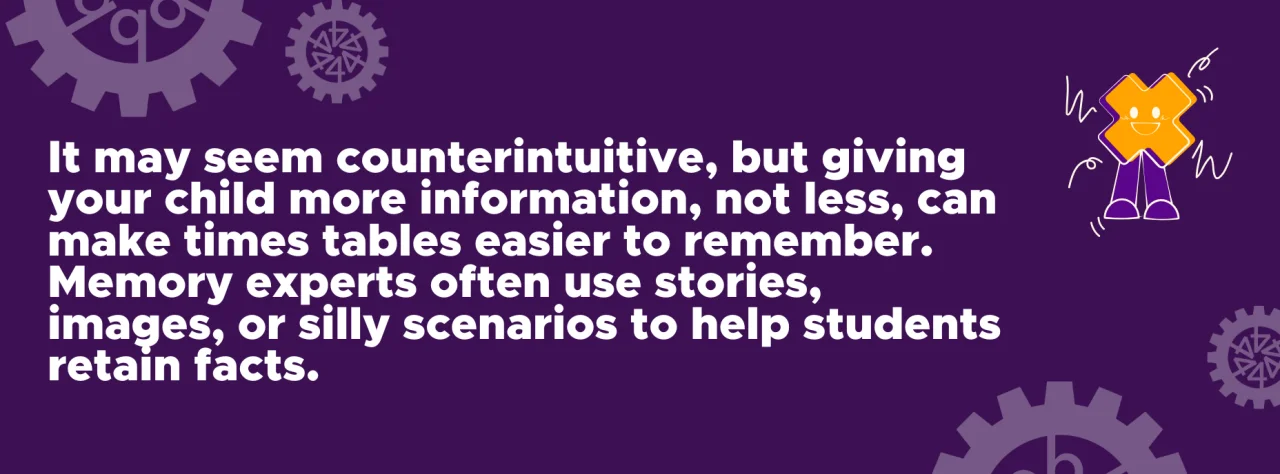 It may seem counterintuitive, but giving your child more information, not less, can make times tables easier to remember. Memory experts often use stories, images, or silly scenarios to help students retain facts. For example, if a child is struggling with 3 times 7, you could invent a story where there are three doors in a house and behind each door is a key with seven little teeth. Drawing this out visually, you can show that three doors multiplied by seven teeth equals twenty-one teeth altogether. Suddenly, 3 times 7 is not just a number; it is a little story they can picture in their mind. These hooks make abstract numbers more concrete.